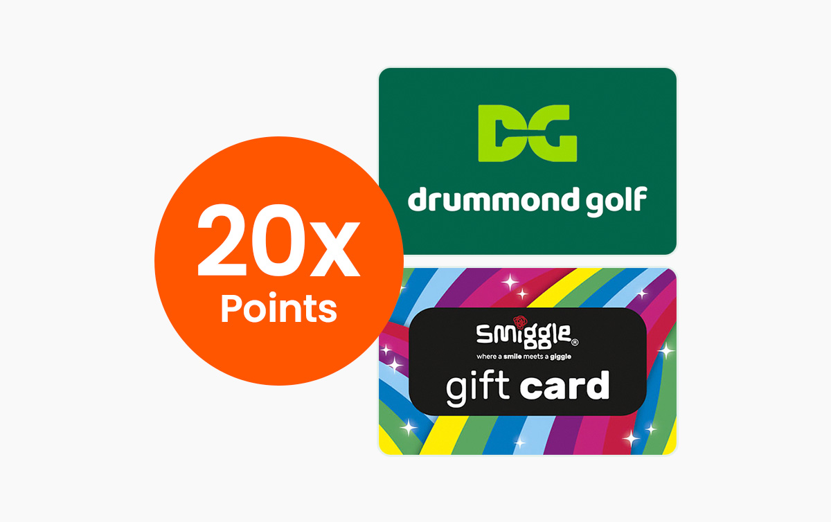 Scan your Everyday Rewards card when you purchase Drummond Golf or Smiggle gift cards in-store at Big W between 26 Feb and 4 Mar 2026 and you will earn 20x points per dollar spent.