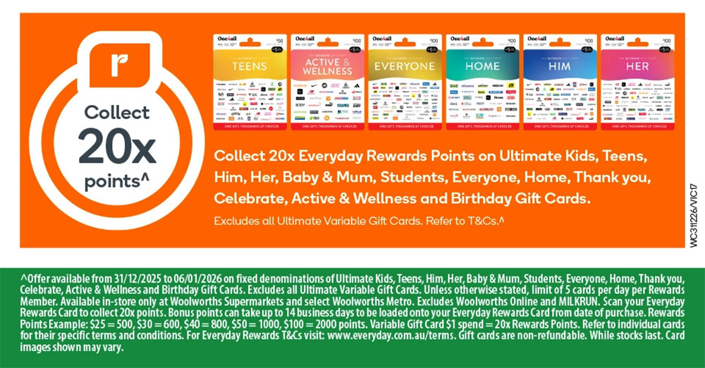 | Woolworths | 20x points on Ultimate gift cards | 31/12/2025 | 6/1/2026 | Image |