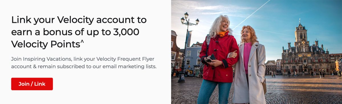 This offer is only available to Velocity Members who link their Velocity account with Inspiring Vacations during the Offer Period. This offer can only be earned by each Velocity Member once. This offer can be reviewed or withdrawn at any time at the discretion of Inspiring Vacations or Velocity Frequent Flyer. A Velocity Frequent Flyer membership is required to earn and redeem Velocity Points. Inspiring Vacations customers can join Velocity Frequent Flyer for free by visiting here. Velocity membership terms and conditions apply.