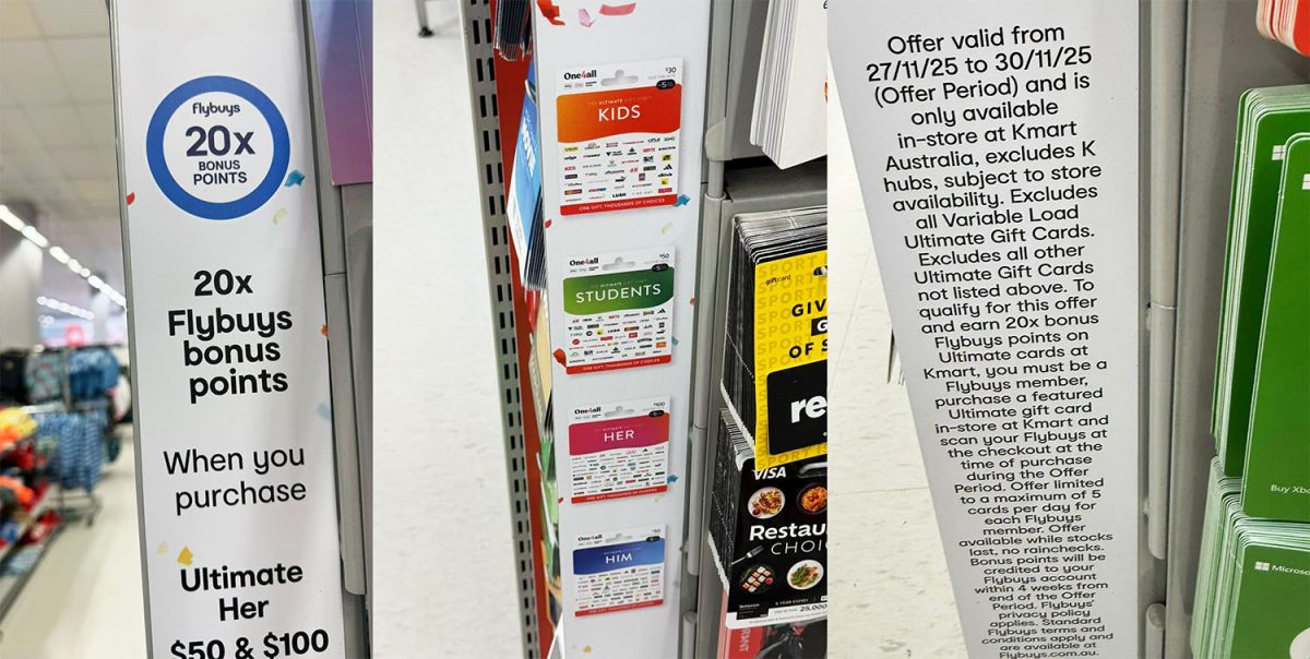 There’s a purchase limit of five gift cards per day per Flybuys account. Note that the variable load Ultimate gift cards are excluded so make sure you only buy the ones pictured on the signage.