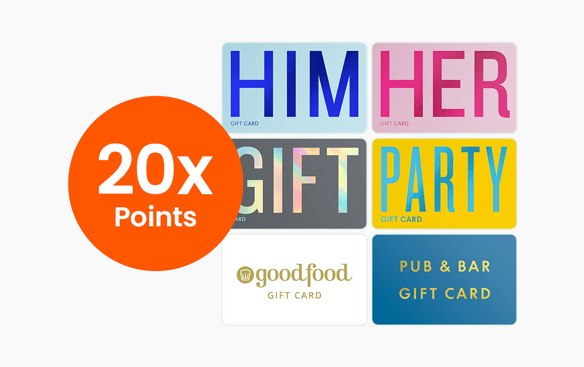 Earn 20x Everyday Rewards points per dollar spent on all denominations of TCN Gift, Party, Him, Her, Good Food and Pub & Bar gift cards at Woolworths.