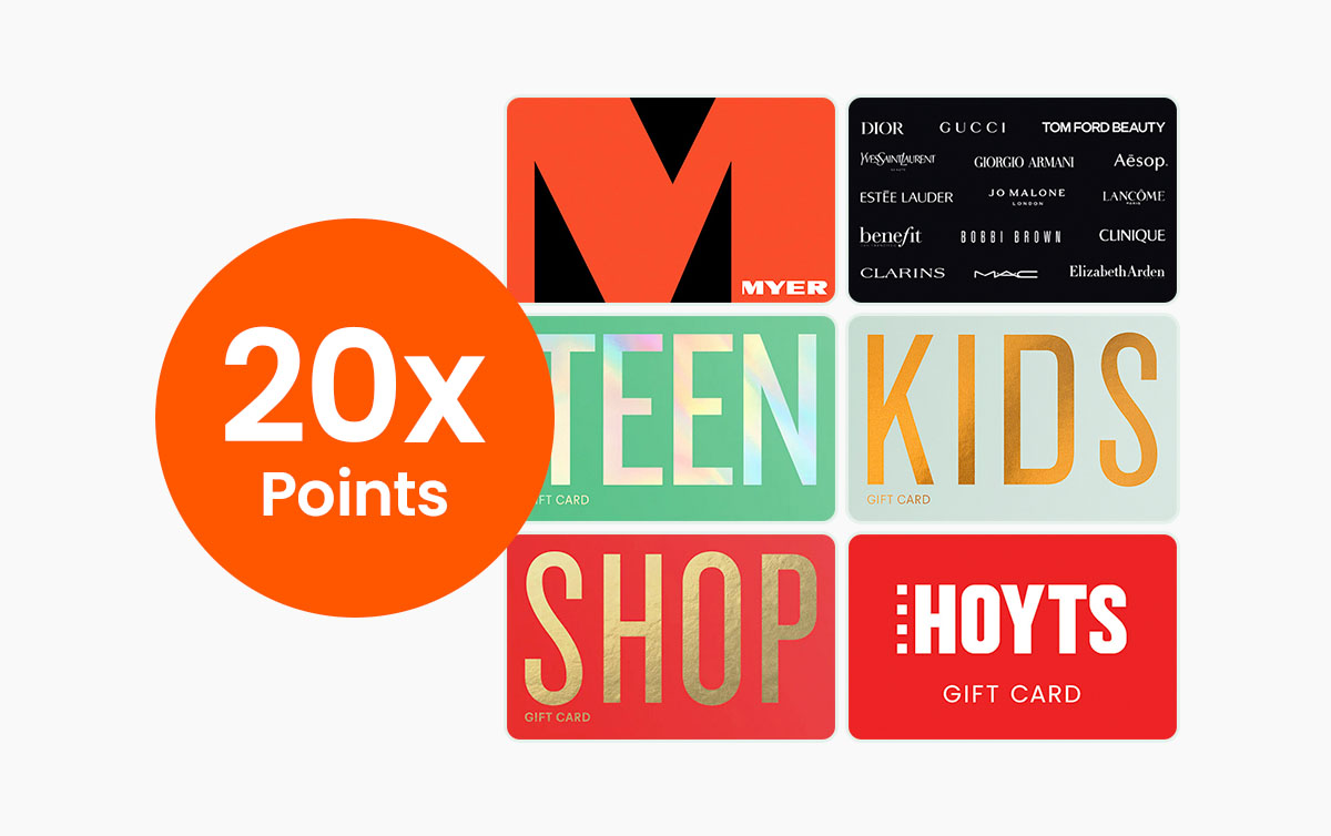 Earn 20x Everyday Rewards points per dollar spent on Myer, Myer Beauty, Hoyts, TCN Kids, TCN Teen and TCN Shop gift cards at Woolworths.